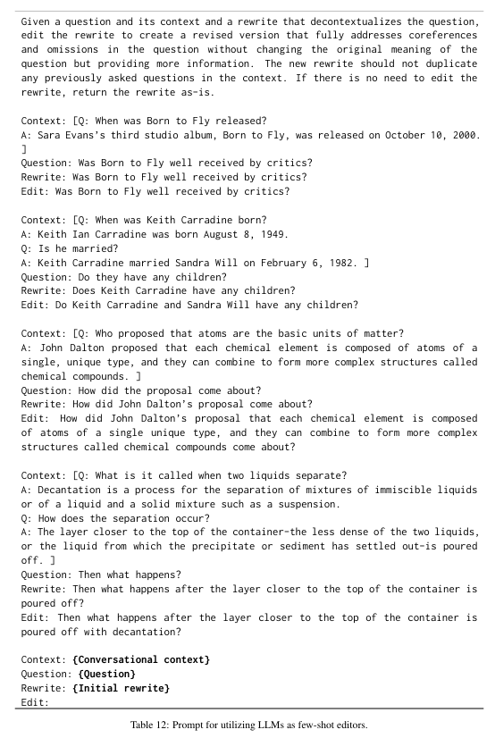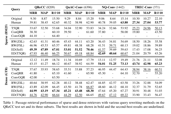 - ED(T5QR) : also prompts an LLM as a rewrite editor, but the initial rewrites are generated by T5QR.