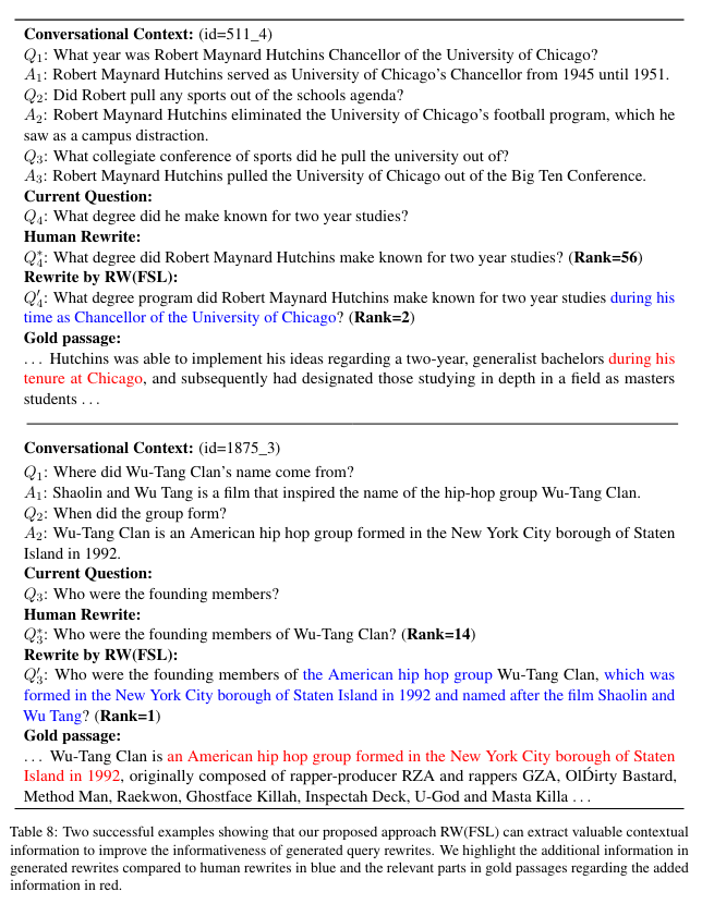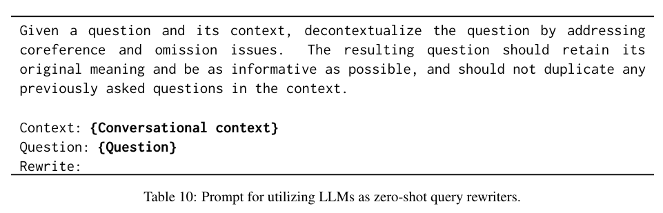 - Informativeness: The rewritten query should incorporate as much valuable and relevant information from the conversational context as possible, thereby providing more useful information to the off-the-shelf retriever.